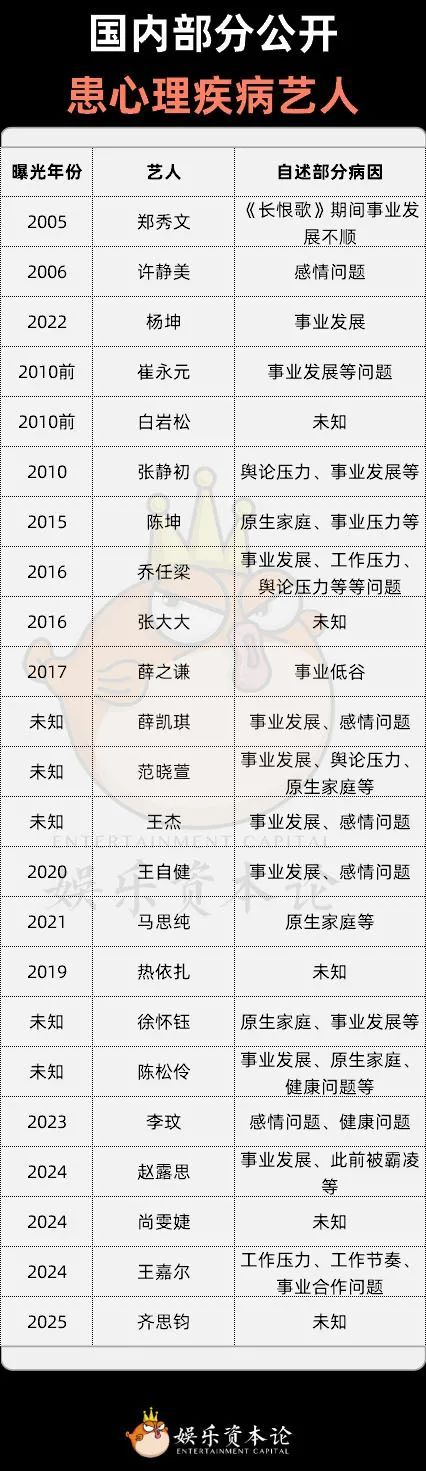 近期,赵露思、齐思钧等多位艺人相继公开自身患有抑郁症、双相情感障碍等心理疾病,再度将艺人心理健康问题推至公众视野。据不完全统计,国内已有超过20位艺人主动公开心理疾病困扰,娱乐圈对心理健康的讨论正经历从禁忌到议题公开化的转变。2016年乔任梁的离世使行业更为重视心理健康议题,公众讨论从“明星为何抑郁”转向“他们承受着什么”。