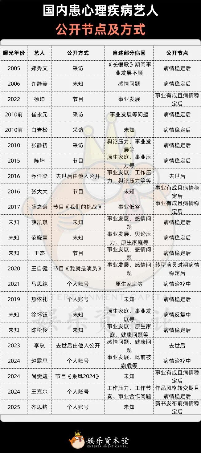 据娱乐资本论统计,当前艺人公开心理疾病症主要通过三种渠道:媒体采访、个人社交媒体自主发声、以及由他人公开。