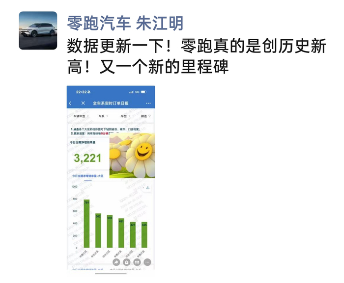 4月20日晚,朱江明在朋友圈中分享:零跑(锁单)真的创历史新高!又一个新的里程碑。截图显示,当天零跑净增锁单量达3221台!3000+台,在五年前,是所有零跑销售努力一个月的成果,而如今成为能于一日内达成的目标。