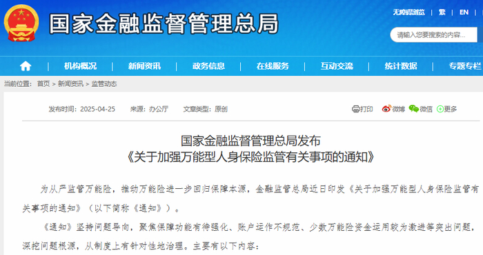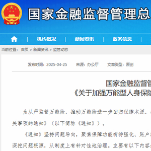 【环球网财经综合报道】4月25日,金融监管总局发布《关于加强万能型人身保险监管有关事项的通知》(简称《通知》),对万能险产品设计、账户管理、资金运用等方面提出新的监管要求,是为解决保障功能有待强化、账户运作不规范、少数万能险资金运用较为激进等突出问题。此《通知》将于2025年5月1日起正式实施,现有不符合规定的万能险业务需在2026年4月30日前完成整改。