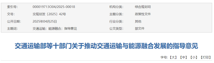2025年4月25日,交通部在官网发布了《关于推动交通运输与能源融合发展的指导意见》(以下简称《意见》)。
