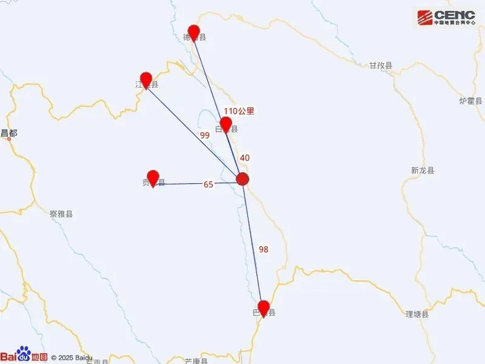 周边县城:震中距白玉县40公里、距西藏贡觉县65公里、距巴塘县98公里、距西藏江达县99公里、距德格县110公里,距西藏昌都市173公里,距成都市491公里。