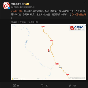 四川甘孜州白玉县发生4.9级地震,震源深度10千米 观察者网 观察者网官方账号 2025.04.2612:55 关注 @中国地震台网 消息,中国地震台网正式测定:4月26日12时21分在四川甘孜州白玉县(北纬30.87度,东经98.95度)发生4.9级地震,震源深度10千米。