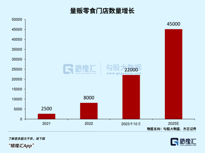 方正证券研报数据显示,21年底国内量贩零食门店总数仅2500家左右,但2025年国内量贩零食门店数就将达到4.5万家,市场规模将达到1239亿元。