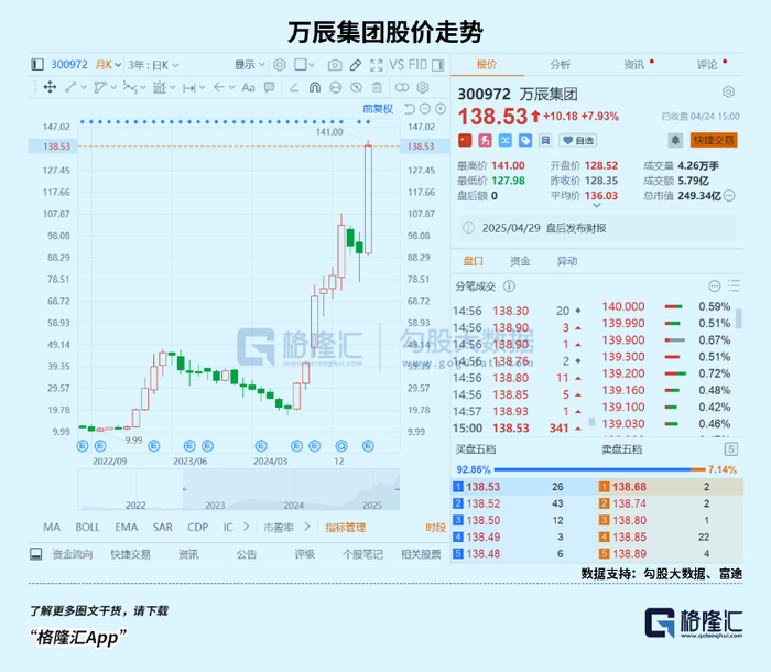 拉长时间来看,从2022年10月仅10.17元/股的股价开始,不到三年的时间里,万辰集团股价已上涨12倍。