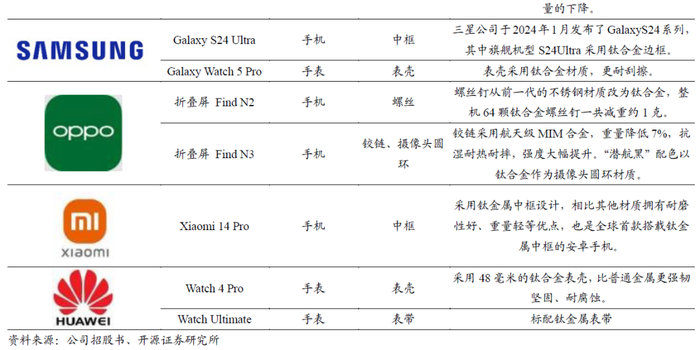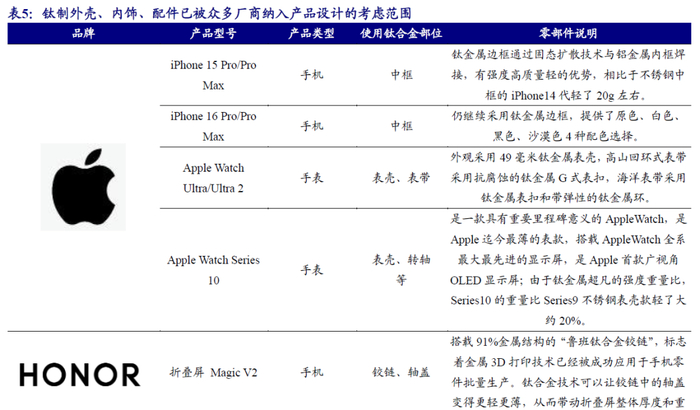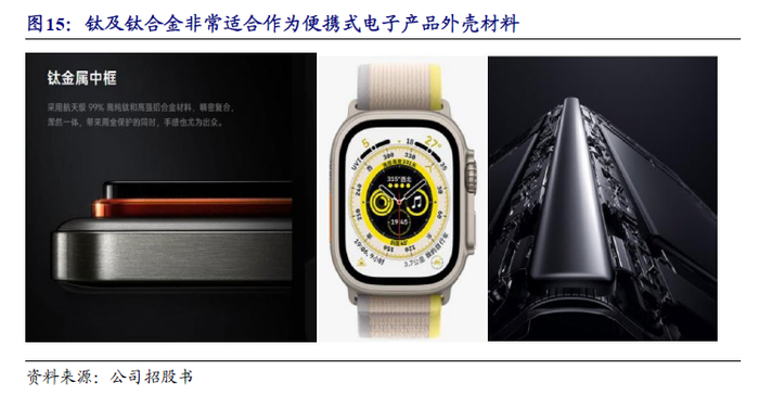 然而钛材的成本目前仍相对较高,因此,在消费电子产品中,钛材目前仍只用于高端消费电子产品,如高端手机/笔记本电脑、高端相机等各类高端精密电子产品,随着行业规模的扩大和生产加工成本的进一步降低,未来钛材在该领域的应用规模有望进一步扩大。