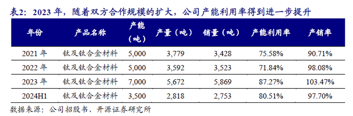 产能&产量端:公司主要实行以销定产,并以合理、适量、预测性备货为辅助,适当增加钛及钛合金材料的库存。2021年及2022年上半年,公司产能利用率偏低,生产、销售的产品主要以低附加值的钛板为主。钛板的下游应用领域主要是化工能源行业,该行业当前设备更新改造投资需求趋于稳定。公司在满足原有客户情况下积极开拓消费电子市场,2022年下半年开始,公司战略调增用于消费电子领域的高附加值钛及钛合金线材的生产规模。2023年,随着双方合作规模的扩大,公司产能利用率得到进一步提升。2024 年上半年,因ESG 因素的考量,客户从竞争对手处采购的数量增加,导致公司在 2024 年上半年线材销量和产量有所下降,因此2024 年 1-6 月产能利用率有所下降。