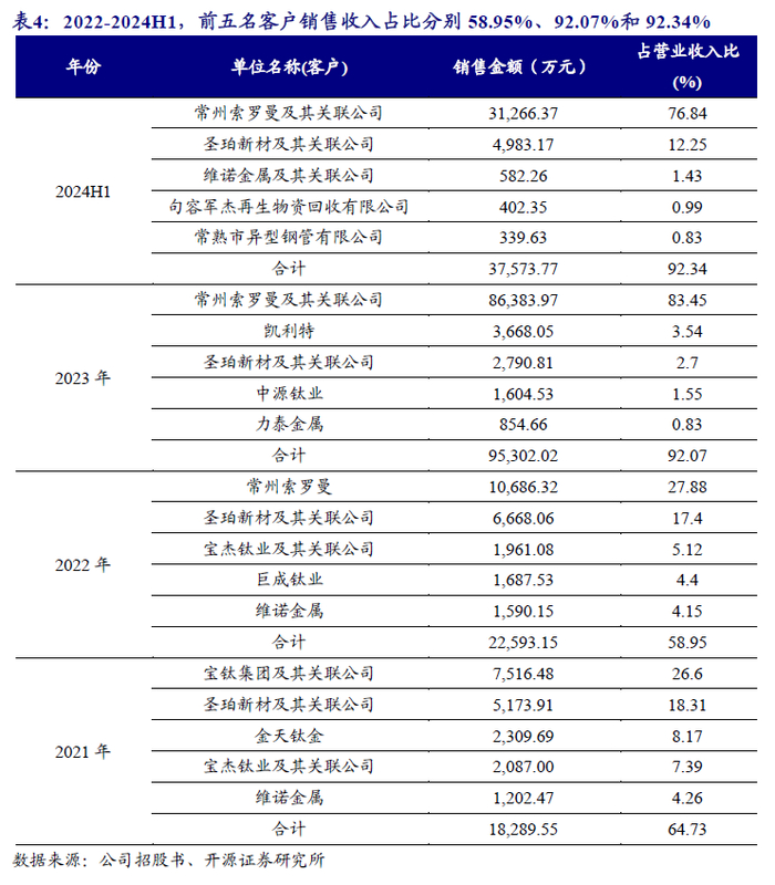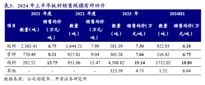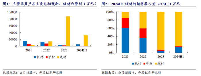 2021-2024H1线材的销售收入分别为4,021.00万元、14,717.65万元、88,018.54万元和32181.01万元,占主营业务收入的比例分别为15.28%、40.60%、91.12%和83.21%;板材的销售收入分别为15,970.45万元、13,144.58万元、4,246.27万元和5699.29万元,占主营业务收入的比例分别为60.69%、36.26%、4.40%和14.74%;管材的销售收入分别为6,323.14万元、8,390.46万元、2,801.86万元和786.25万元,占主营业务收入的比例分别为24.03%、23.14%、2.89%、2.03%,呈下降趋势。