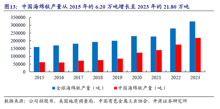 根据美国地质调查局和中国有色金属工业协会数据显示,全球及中国海绵钛产量整体均呈现上升趋势,全球海绵钛产量从2015年的16.00万吨增长至2023年的32.40万吨,复合增长率为8.16%;中国海绵钛产量从2015年的6.20万吨增长至2023年的21.80万吨,复合增长率为14.99%,增速超过全球海绵钛产量增速。
