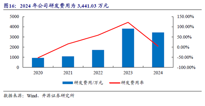 公司仍在持续加大研发投入,研发费用整体呈现增长态势。2020-2024年研发费用分别为939.04万元、1085.08万元、1719.53万元、3812.47万元、3,441.03万元,研发费用率分别为5.16%、3.84%、4.49%、3.68%、4.29%。