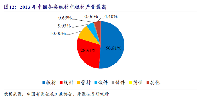 从产品结构来看,钛加工材可分为板材、管材、线材、锻件、铸件、箔带等。2023年中国各类钛材中板材产量最高,为8.1万吨(含钛板和卷带);线材的产量从2022年的3.5万吨大幅提升至2023年的4.6万吨,占比从23.18%提升至28.91%。