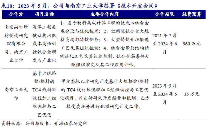2021年12月,公司与句容市科学技术局签署《句容市科技项目合同》,由公司承担句容市科技计划海洋工程关键结构用低成本高强耐蚀钛合金研发与产业化项目的研究开发或建设任务。公司作为项目承担单位,参加单位包括南京尚吉增材制造研究院有限公司、南京工业大学。2023年5月,公司与南京工业大学签署《技术开发合同》,研究开发基于大规格锭/棒材的TC4线材短流程加工组织调控与工艺优化项目,并支付研究开发经费和报酬。
