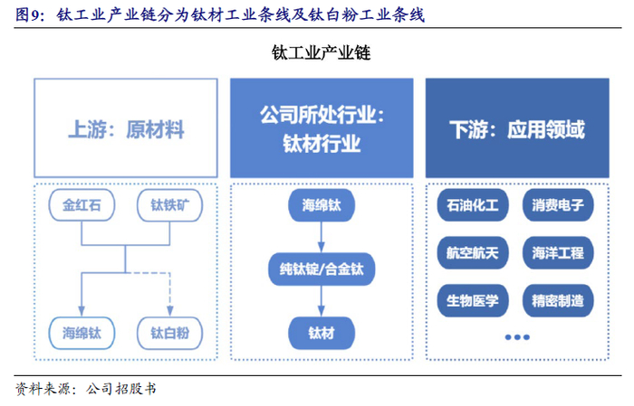 钛工业产业链分为钛材工业条线及钛白粉工业条线。钛材工业条线上游为由钛矿制备海绵钛,中游为将海绵钛熔铸成锭并加工成钛材及钛构件,即熔炼海绵钛得到钛锭或添加合金熔炼为钛合金铸锭,通过加工铸锭得到钛及钛合金坯料,并采用锻造、轧制、挤压、拉拔等工艺的变形处理、热处理和机械加工等生产出不同规格的钛及钛合金产品,如板材、管材、线材等。钛产业链下游为化工、航空航天等领域的应用,通过加工工艺,将钛材制造成各类钛零件。在整个钛材工业条线中,海绵钛产量反映的是原料生产能力,钛材产量反映的是深加工能力。钛白粉工业条线上游为对钛铁矿和金红石进行采选,并通过化学过程生成中间产品钛白粉,下游主要应用于涂料、塑料和造纸等行业。