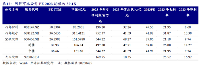 天工股份同行可比公司PE 2023均值为39.1X。天工股份从事钛及钛合金材料的研发、生产与销售,将原材料海绵钛与其他金属元素通过配比、熔炼、锻造及各种精加工工序,制作成能最大程度发挥钛及钛合金材料技术性能的产品。公司钛及钛合金产品从粗加工逐步向精加工、深加工转型,包括消费电子行业、3D打印领域的钛合金线材等,开拓更广阔的新兴市场。考虑到公司技术及品牌优势,有望进一步提高行业渗透率,建议关注。