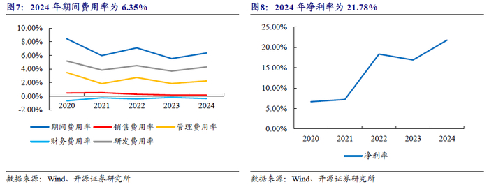 期间费用呈下降趋势,成本控制能力较强。2020-2024年,期间费用率分别为8.43% 、5.96%、7.10%、5.52%、6.35%。