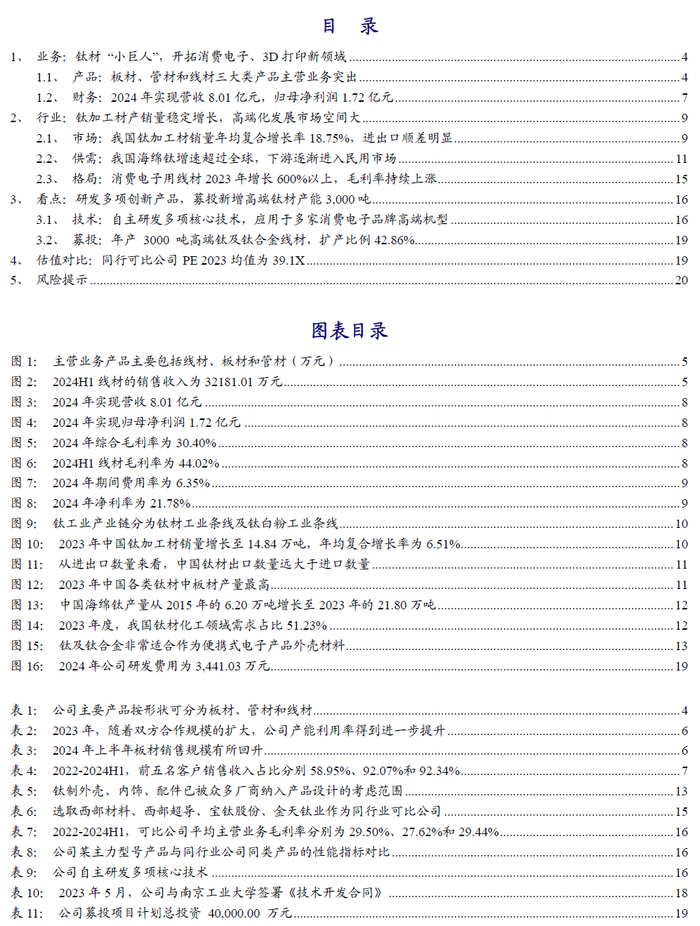 技术:公司经过多年布局和投入,成功研发出符合下游客户要求的各类消费电子用钛材,并率先应用于多家消费电子市场主导品牌的高端机型。先后研发出增材用高抗冲击低成本钛合金丝材、航天航空用耐高温型轻质钛合金等创新型产品。募投:募投项目计划总投资 40,000 万元,拟通过在现有土地新建生产车间,凭借公司拥有的产品专利技术、技术研发储备与现有生产设施,新增生产及其他辅助设备,实现年产 3,000 吨高端钛及钛合金棒、丝材的能力。项目建成达产后将新增高端钛及钛合金棒材2,000吨、丝材1,000吨,合计新增公司高端钛及钛合金线材产能3,000吨,相较于现有产能7,000吨测算,扩产比例为42.86%。