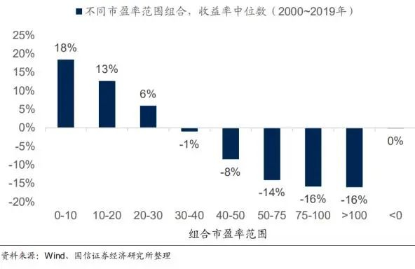 统计分析显示,长期来看,低估值策略有明显的超额收益。市盈率在10倍以下(不含亏算市盈率为负股票)组合的收益率中位数高达18%,远远领先其他各个市盈率范围组合的收益率中位数,而且可以发现,组合收益率的中位数与组合市盈率高低呈现出非常强烈的负向关系,即组合的市盈率越低收益率越高。