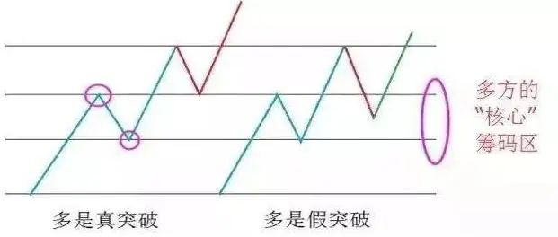 如果空方的反击跌破“前一个高点”,则说明空方的力度较大,空方进入多方的“核心”区间,上升趋势开始减弱,其后的突破高点时多方“力竭”,所以突破多是假突破。