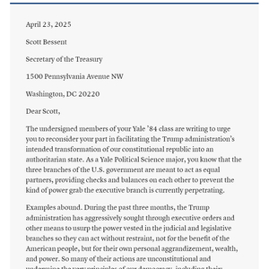致贝森特的信中表示,作为耶鲁大学政治学专业的学生,贝森特知道“美国政府的三个部门应该作为平等的合作伙伴,相互制衡,以防止行政部门目前正在实施的那种权力攫取。”