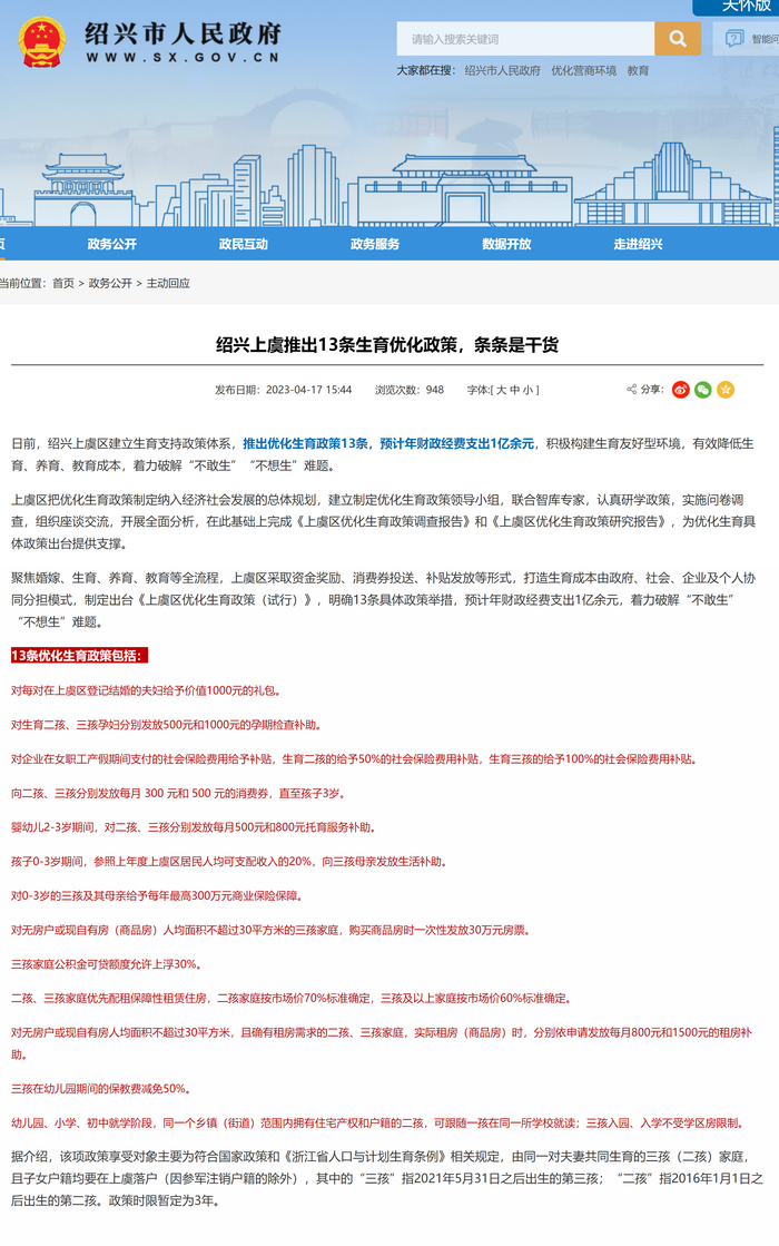 在浙江,不少地区此前就已推出结婚奖励政策。2023年4月,绍兴市上虞区推出13条优化生育政策,其中包含为每对在当地登记结婚的夫妇提供价值1000元的礼包;同年8月,衢州市常山县宣布,对在当地初次登记结婚且女方年龄在25周岁及以下(至少一方为常山户籍)的夫妇,给予1000元奖励。