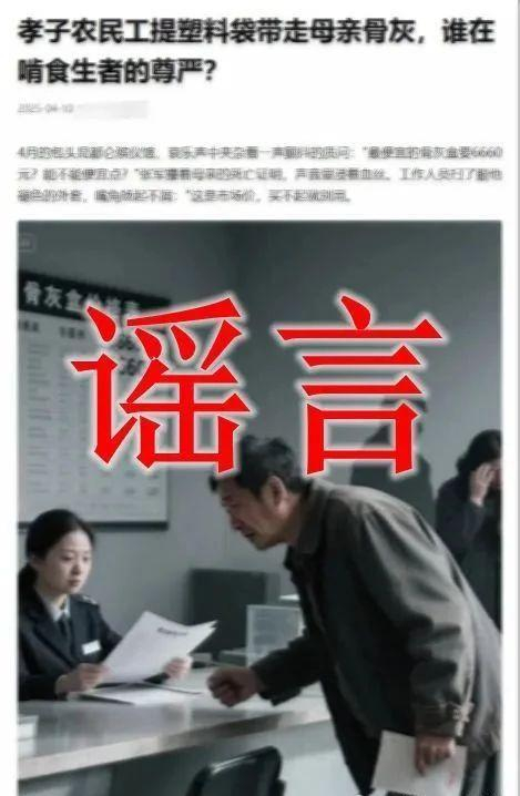 近日,一则“孝子农民工提塑料袋带走母亲骨灰,谁在啃食生者的尊严”的不实信息在网络平台传播,引发网民关注讨论。