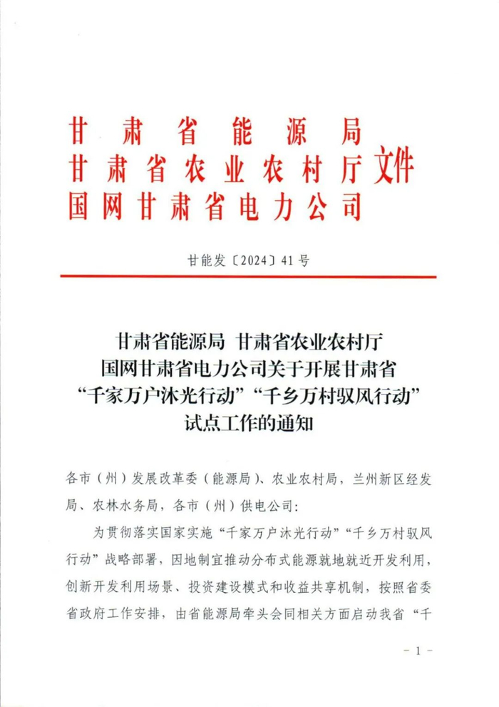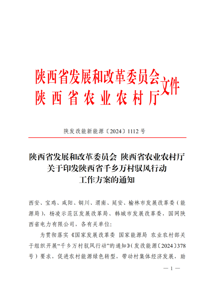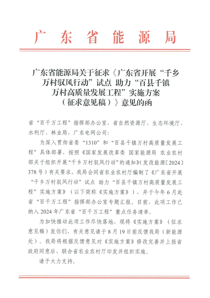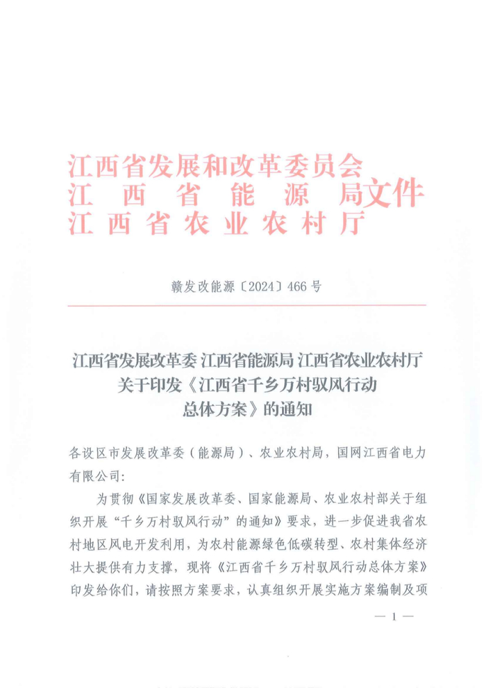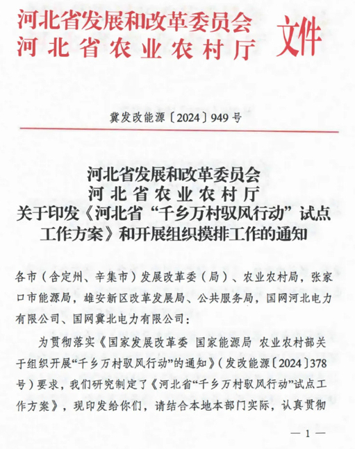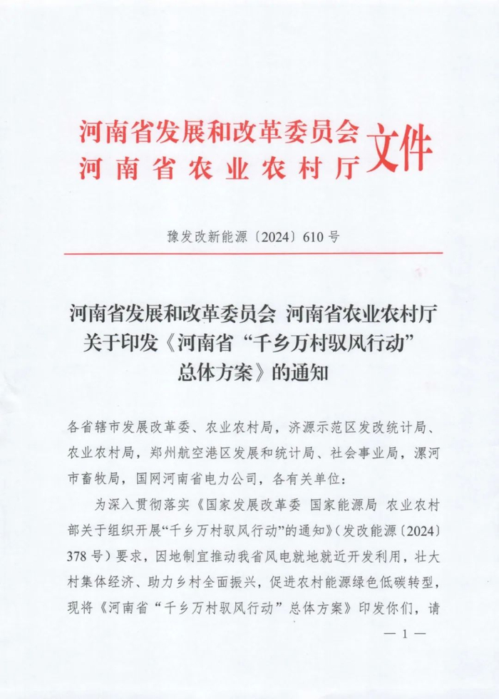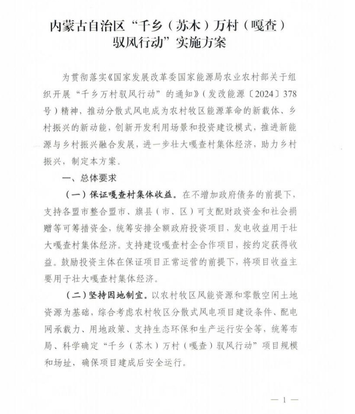 2024年3月,国家发展改革委、国家能源局、农业农村部三部门联合印发《关于组织开展“千乡万村驭风行动的通知》,共同组织实施。其中提出,创新风电投资建设模式和土地利用机制,实施“千乡万村驭风行动”,提出以县域为单元大力推动乡村风电建设,推动100个左右的县、10000个左右的行政村乡村风电开发。