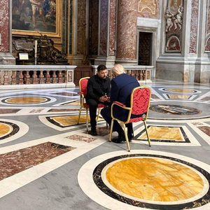 乌克兰方面发布的照片显示,两位领导人在没有助手的情况下,在梵蒂冈富丽堂皇的圣彼得大教堂里进行了密切的讨论。