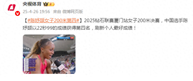陈妤颉获女子200米决赛第四名 环球网 环球网官方账号 2025.04.2620:28 关注 来源:央视体育 2025钻石联赛厦门站女子200米决赛,中国选手陈妤颉以22秒99的成绩获得第四名,刷新个人最好成绩!