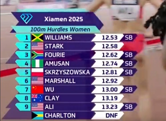 4月26日,2025世界田联钻石联赛厦门站拉开战幕。备受关注的女子100米栏在20时24分鸣枪。持外卡身份参赛的吴艳妮以“战斗天使”阿丽塔造型出赛,以13秒00刷新个人赛季最佳成绩,获得第七名。