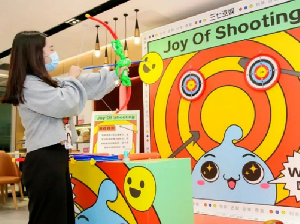 沙滩以解压为主题,设置了“大锤小用”“鸡哔你”“打工人划水大赛”“打工人吃瓜大赛”“摸鱼大作战”“KPI摆烂圈圈”等各类主题互动小游戏,通过完成游戏,获得盖章,最终可赢得“释放压力”游戏体验礼品。
