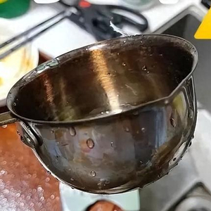 这种“淋油勺”和汤勺差不多大,但更深一点,主要是用来炝油,往勺里倒一些油,也可以同时放花椒、辣椒、葱姜蒜等,放在煤气灶上小火加热,等油烧到合适的温度后,直接浇到菜上,看起来简单快捷。
