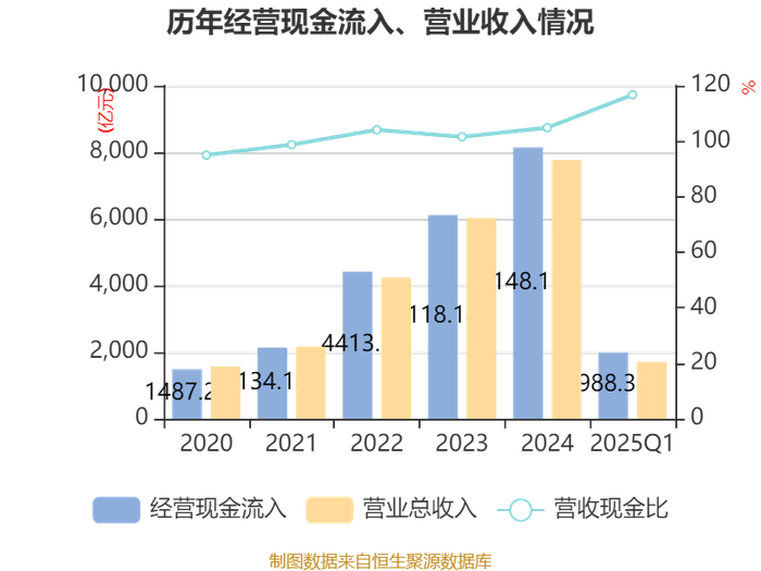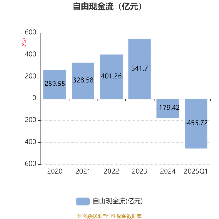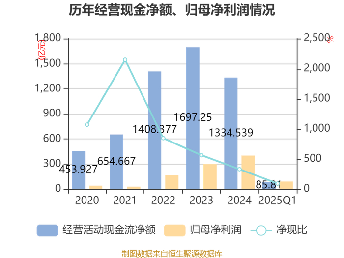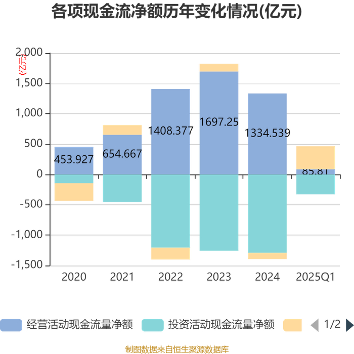 截至2025年一季度末,公司经营活动现金流净额为85.81亿元,同比下降16.1%;筹资活动现金流净额380亿元,同比增加431.84亿元;投资活动现金流净额-327.4亿元,上年同期为-272.7亿元。