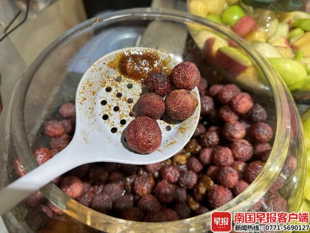 有食客将椒盐撒在杨梅上,这独特的搭配便成了应季的美味酸嘢。在古城路一家酸嘢摊上的杨梅酸嘢24元/公斤,不少市民购买品尝。南宁市民还解锁了杨梅的更多打开方式,在餐桌上,杨梅变成了别具一格的特色菜肴,酸爽的口感恰到好处地化解了油腻,令人食欲大增;在咖啡爱好者的手中,杨梅与咖啡香相互交融,碰撞出独特的味觉体验,成了炎炎夏日里备受追捧的特调饮品。