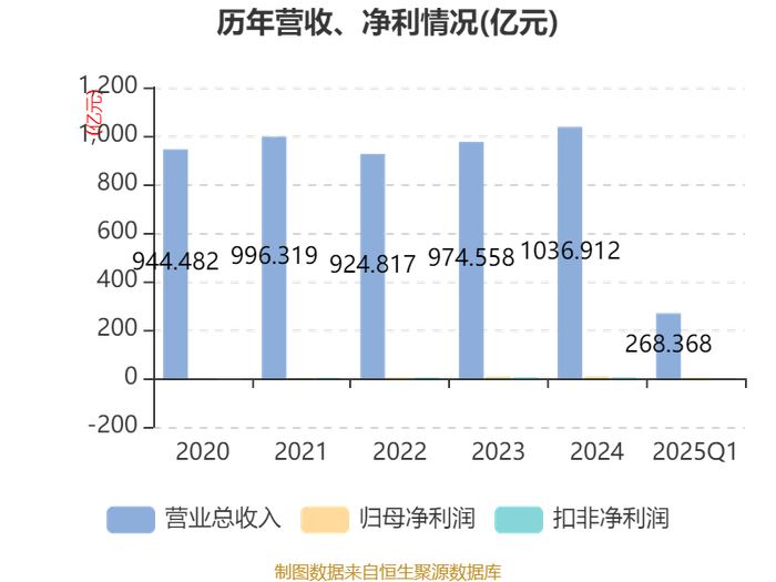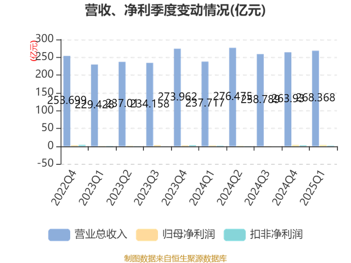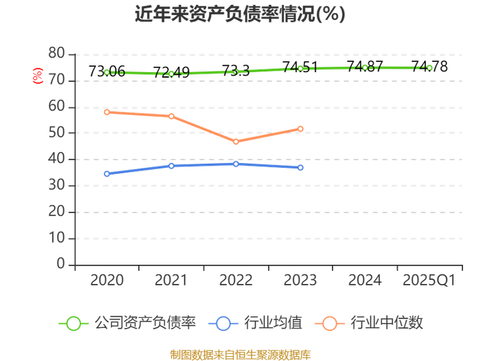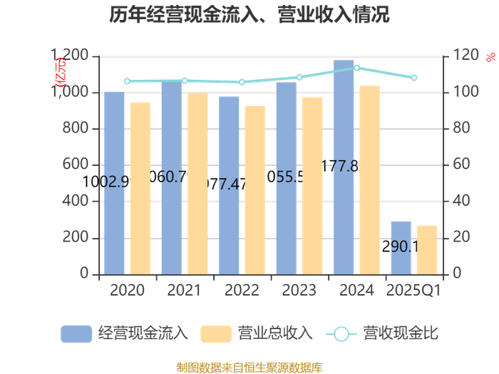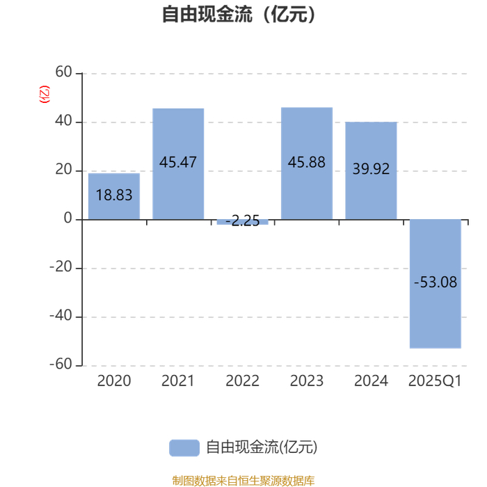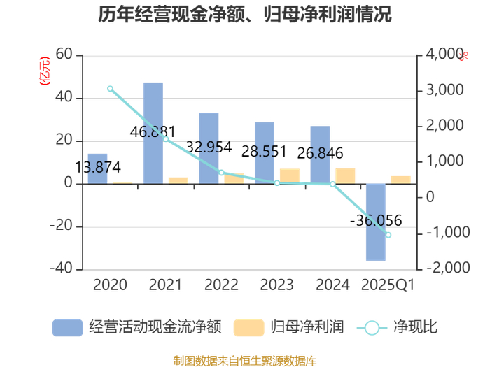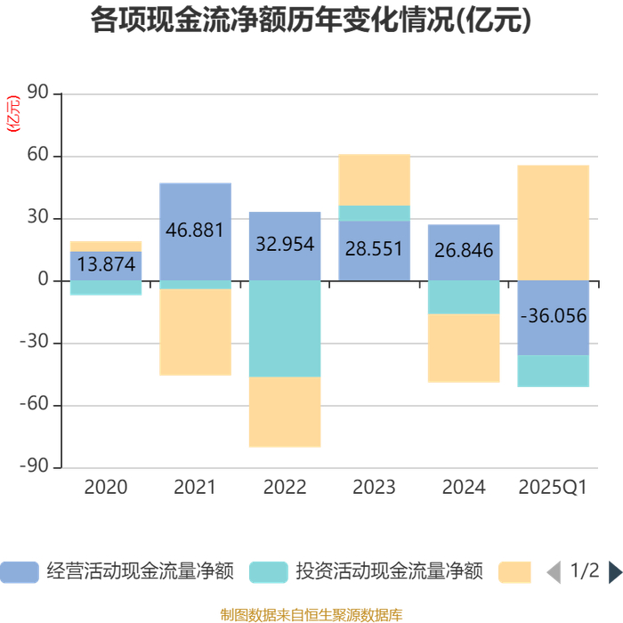 截至2025年一季度末,公司经营活动现金流净额为-36.06亿元,同比减少5.22亿元;筹资活动现金流净额55.4亿元,同比增加26.99亿元;投资活动现金流净额-15.28亿元,上年同期为-4.3亿元。