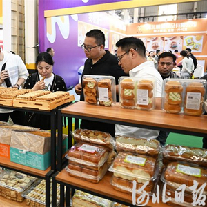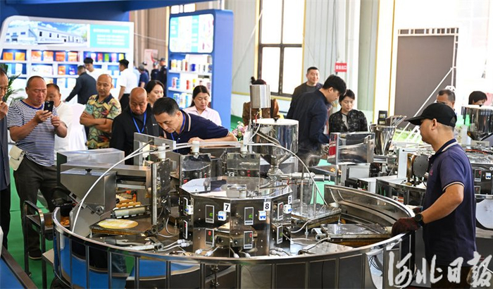 4月25日,在第三届河北(宁晋)食品产业博览会上,邢台一家食品包装设备公司工作人员在演示生产流程。