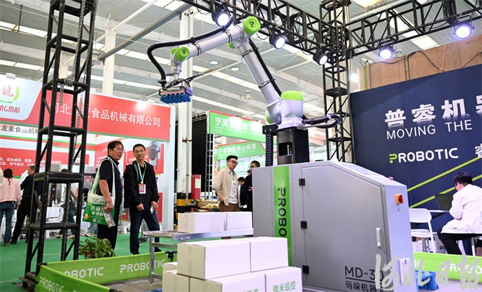 4月25日,在第三届河北(宁晋)食品产业博览会上,嘉宾在参观石家庄一家科技公司展示的码垛机器人。