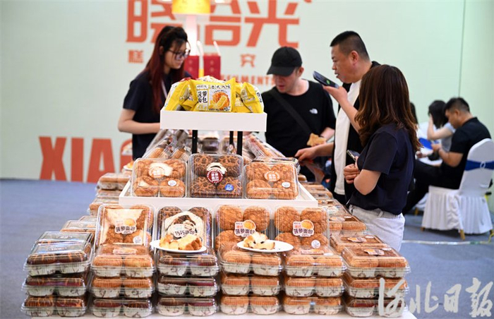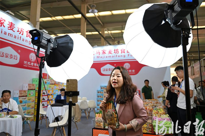 4月25日,在第三届河北(宁晋)食品产业博览会上,一位主播网上销售休闲食品。