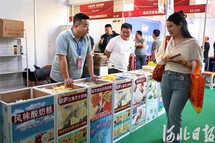 4月25日,在第三届河北(宁晋)食品产业博览会上,一位嘉宾与参展商洽谈。