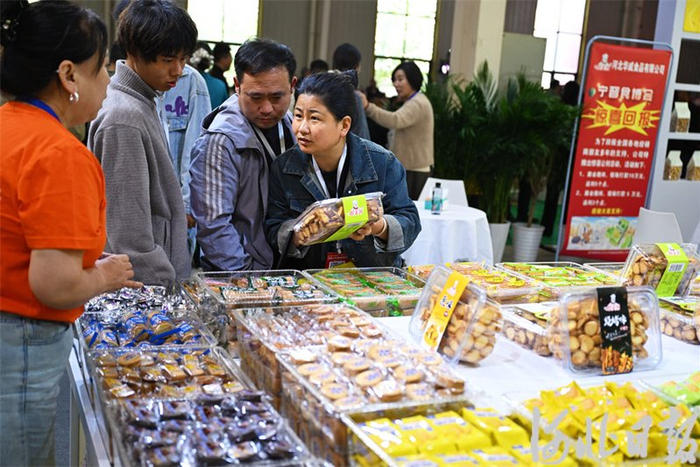 4月25日,观众在第三届河北(宁晋)食品产业博览会上参观、品尝美食。