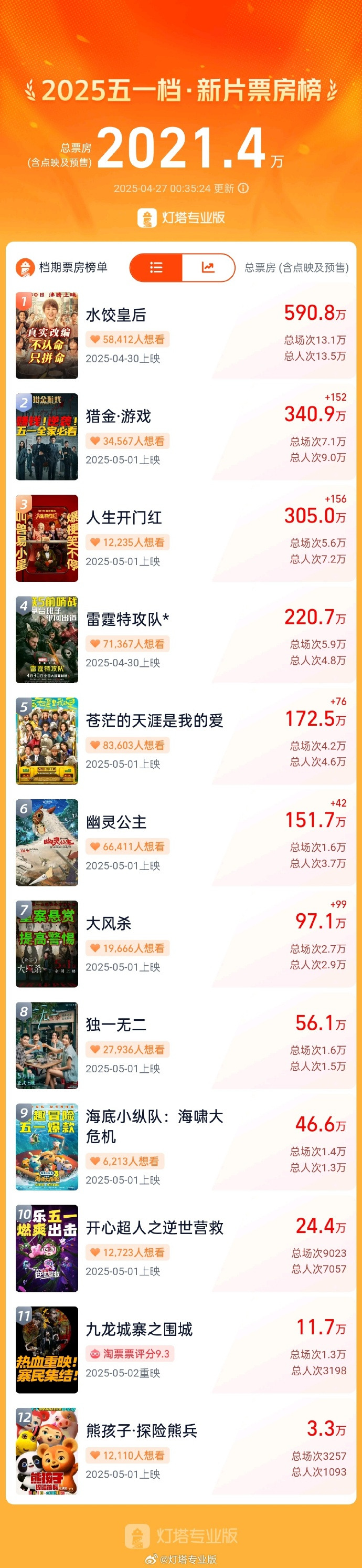 据灯塔专业版,截至4月27日0时35分,2025年五一档新片(含重映)预售总票房(含点映)突破2000万元,影片《水饺皇后》《猎金·游戏》《人生开门红》《雷霆特工队*》《苍茫的天涯是我的爱》暂列前五。
