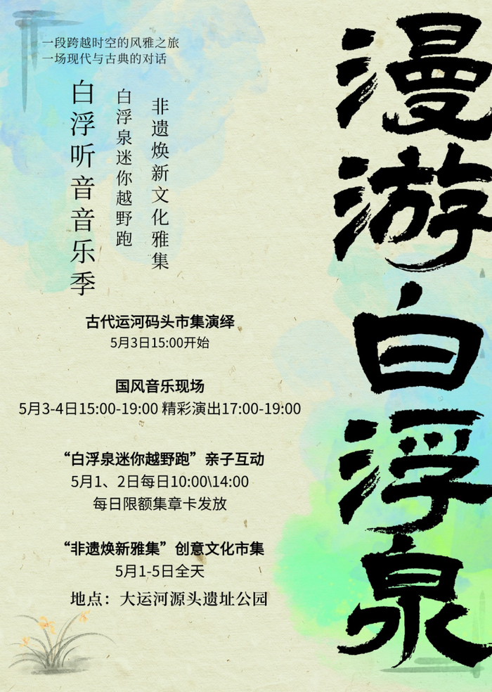 5月1日至5月5日,“漫游白浮泉”旅游文化季将在大运河源头遗址公园拉开序幕。其中,5月3日-4日,重点打造的第三届“白浮泉听音”音乐会将以“专业+本土”双轨交织的演出模式呈现,音乐会巧妙地选址在湖边,波光粼粼的水面将成为天然的背景舞台,而潺潺的泉水声则如同一场动人的序曲,为即将上演的音乐盛宴增添了一份灵动与诗意。