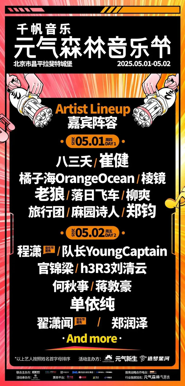 2025千帆音乐·元气森林音乐节将于2025年5月1-2日在昌平区北七家镇拉菲特城堡举办。本次音乐节拟邀请崔健、老狼、郑钧等资深音乐人,八三夭、旅行团等当红乐队,以及单依纯、程潇、翟潇闻等新生代艺人联袂演出,打造多元化的音乐盛宴。详戳>>
