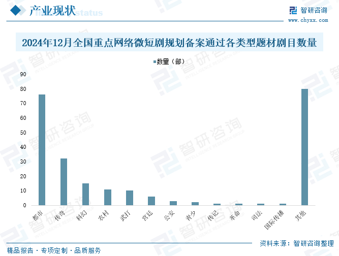 从微短剧题材类型来看,目前都市题材类的微短剧仍是市场投资关注的重点,而传奇类、科幻类的微短剧题材也逐渐成为市场关注重点。根据国家广播电视总局网络视听节目管理司公布的信息来看,2024年12月,在全国重点网络微短剧规划备案公示的239部网络微短剧中,都市题材76部,占比31.80%;农村题材11部,占比4.6%;青少题材2部占比0.84%;革命题材1部,占比0.42%;司法题材1部,占比0.42%;公安题材3部,占比1.26%;科幻题材15部,占比6.28%;传记题材1部,占比0.42%;传奇题材32部,占比13.39%;武打题材10部,占比4.18%;宫廷题材6部,占比2.51%;国际传播题材1部,占比0.42%;其他题材80部,占比33.47%。