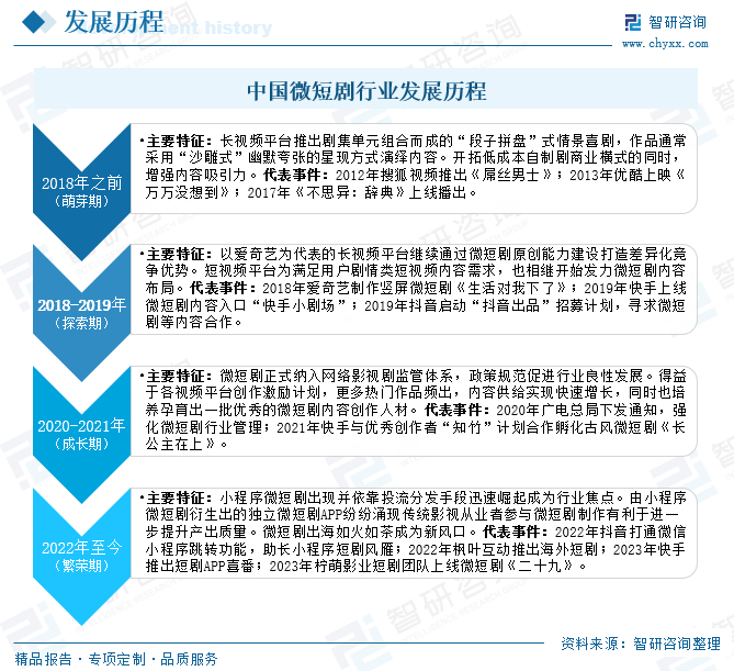 微短剧并非新生事物,早在十年前长视频平台就已进行过试水,但受制于基础网络环境、拍摄剪辑技术以及用户接受度影响,届时并没有形成广泛热度。随着基础网络环境持续改善,视频制作技术进步,尤其是短视频内容形式风靡后短视频平台布局扶持,助推微短剧呈燎原之势不断发展壮大,成为网络视频领域热门赛道。并在短视频平台加入后的短短几年内,实现了从原始野蛮生长到政策规范下有序发展的跨越。及至当前繁荣阶段展现出众多新的发展特征,如小程序、独立APP让用户触达更加多元化,传统影视公司进场让内容创作更加精品化,微短剧内容出海让行业发展更加国际化。