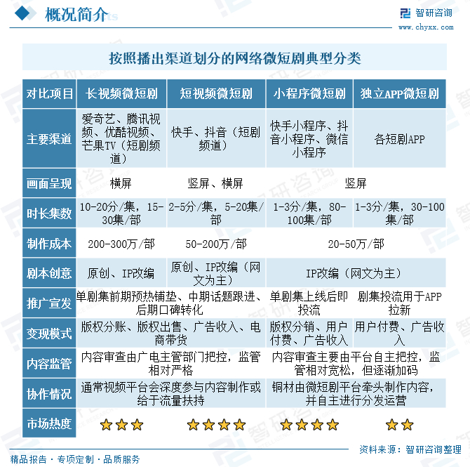 微短剧播出渠道起着承上启下的纽带作用,即上承载内容下触达用户。以播出渠道为抓手,微短剧可再细分为长视频微短剧、短视频微短剧、小程序微短剧和独立APP微短剧。从基本特征、制作过程,到推广宣发及至商业变现,四类微短剧各自差异比较明显。聚焦业务发展底层逻辑,长视频及短视频平台布局微短剧主要用于补充并丰富平台媒体内容生态,重在培养用户内容消费习惯,带来流量持续增长;小程序微短剧和独立APP微短剧主要用于拓展新的业务领域,重在挖掘用户付费价值和广告价值,实现商业利益最大化,不同的是前者重度依赖短视频和微信等流量平台,而后者则试图脱离流量平台限制,构建自有私域流量内容消费场景。总体来看,当前长视频微短剧变现存在局限,独立APP微短剧尚处于尝试阶段,短视频微短剧及依赖短视频等流量平台的小程序微短剧,内容生态和商业模式趋于成熟,市场热度也相对更高。