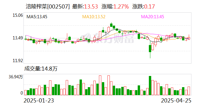 涪陵榨菜还同时公布了2025年一季报,1-3月,实现营业收入7.13亿元,同比略减4.75%;归母净利润2.72亿元,同比微增0.24%;扣非后净利润2.57亿元,同比微降0.62%,整体经营情况保持平稳。(王屹)