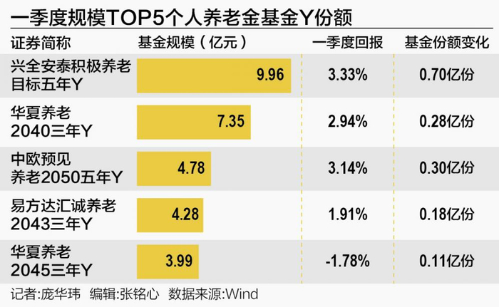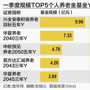 截至2025年一季度末,市场上最大的个人养老金基金为兴全安泰积极养老目标五年Y,规模9.96亿元;紧随其后的是华夏养老2040三年Y,规模7.35亿元;第三名为中欧预见养老2050五年Y,规模4.78亿元;第四名为易方达汇诚养老2043三年Y,规模4.28亿元。
