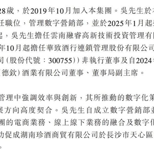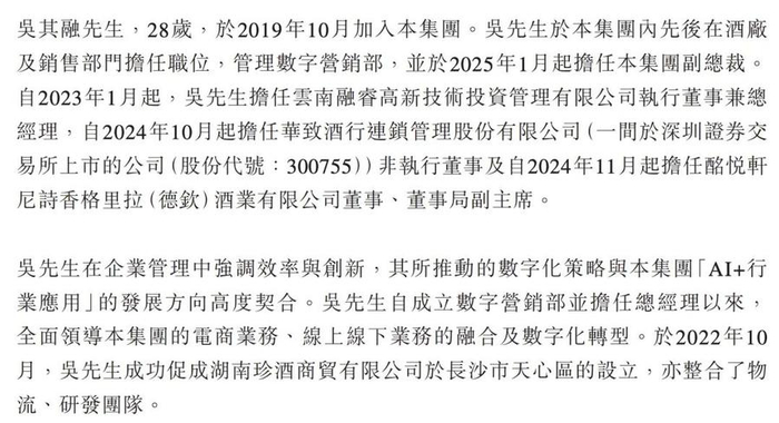 企查查信息显示,其在湖南金东酒业、华泽集团、华致酒行等5家公司任董事或法人,并已实质性参与企业管理。吴其融2019年10月加入珍酒李渡,先后在酒厂及销售部门担任职位,管理数字营销部,今年1月正式出任公司副总裁。