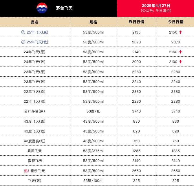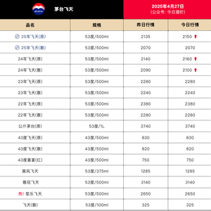 今日酒价披露的批发参考价显示,4月27日,25年飞天茅台原箱较前一日上涨15元,报2150元/瓶。24年飞天茅台原箱较前一日上涨20元,报2160元/瓶;24年飞天茅台散瓶较前一日上涨10元,报2100元/瓶。