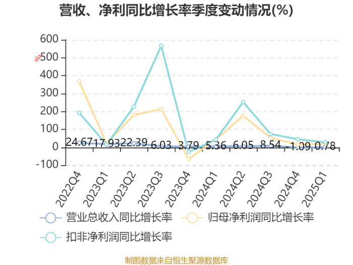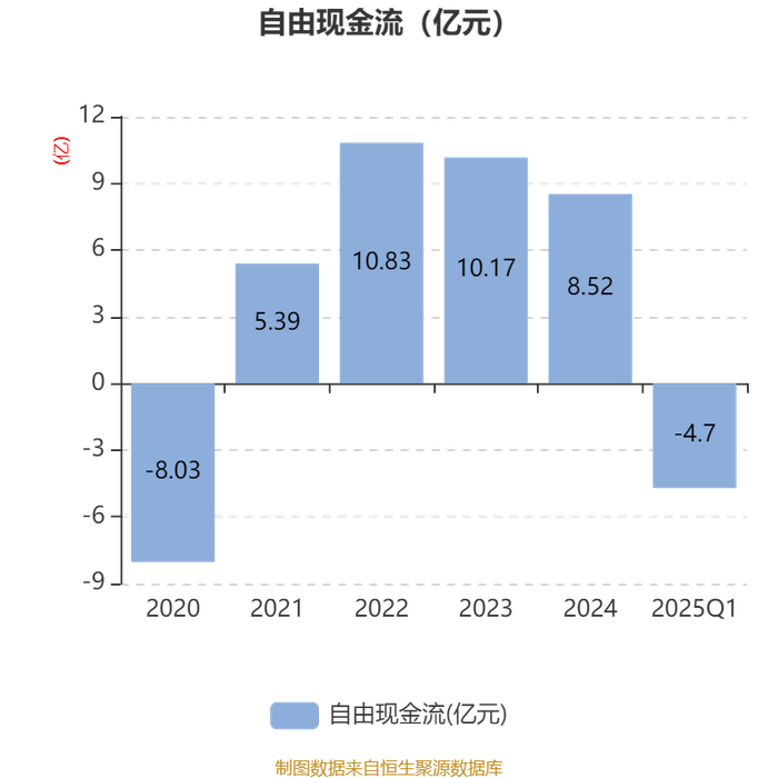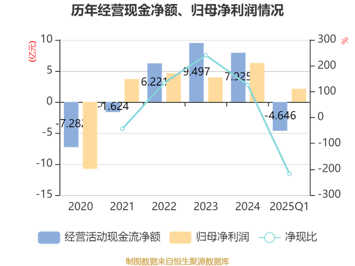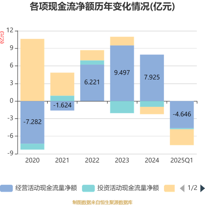 截至2025年一季度末,公司经营活动现金流净额为-4.65亿元,同比减少1.94亿元;筹资活动现金流净额-2.71亿元,同比减少3.97亿元;投资活动现金流净额-1756.7万元,上年同期为-1474.14万元。